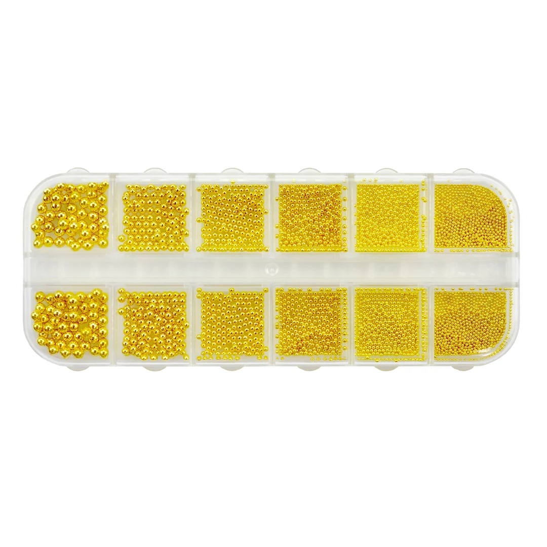 Arany szórógyöngyök 12 különböző méretben köröm. Finom és elegáns körömdíszítésekhez, strasszkövek mellé, aprólékos minták elkészítéséhez.
