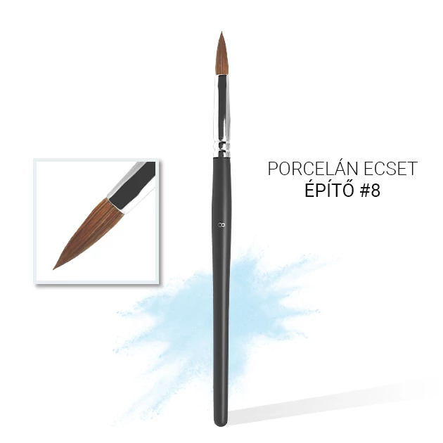 Kolinsky szőrből készült #8-as porcelán építő ecset, kerek, egy pontban végződő fejjel. Fekete, fa nyéllel.