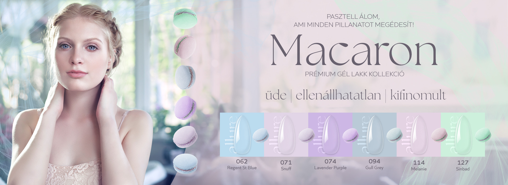 Az allure prémium gél lakk árnyalatokban egyszerre jelenik meg az üde, színekben gazdag fiatalság és az időtlen elegancia. Édesítsd meg szalonod mindennapjait a francia sütikülönlegességek színvilágát idéző Macaron kollekcióval!