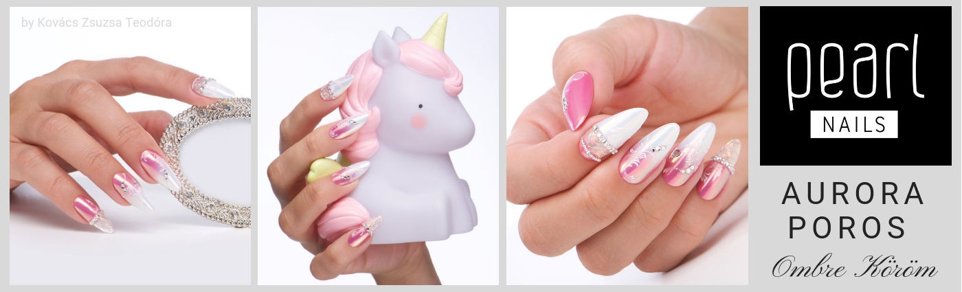 - 1301 és 1332 Premium Finish színes zselével megfestjük a köröm egy-egy részét, kihagyva a fóliás részt, majd egy perc LED lámpázás után bedörzsöljük Aurora pigmentporral.