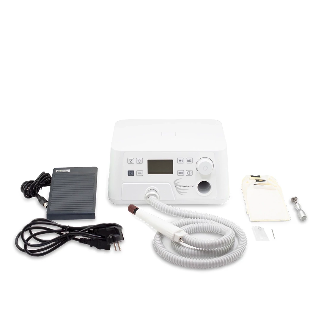 A Marathon Cyclone-Vac egy porelszívóval ellátott, amely gyors, alapos és ultra higiénikus lábápolási kezelést tesz lehetővé. Az intuitív kezelőfelület magas fokú kényelmet biztosít a pedikűrös szakemberek számára. A csendes, ergonomikus fej 4 000 és 40 000 fordulat/perc között változtatható sebességgel és hatékony porzsákos szívórendszer garantálja a minőséget, megfelelve a legmagasabb higiéniai és egészségügyi elvárásoknak a pedikűr során.