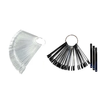 Szétnyitható, pálcás, legyező tip színpaletta. 50 darabos, egyenként karikára húzott tipekkel. Fekete, rózsaszín és átlátszó színekben kapható.