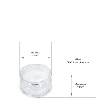 Átlátszó, csavaros tetejű, műanyag tégely, 5ml. Kozmetikai krémek, pigmentek, szilárd vagy porszerű készítmények, körömdíszítők, termékminták tárolására. Praktikus, könnyen tisztítható és fertőtleníthető.