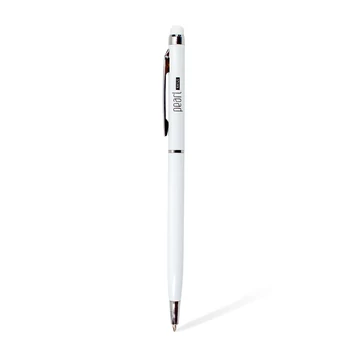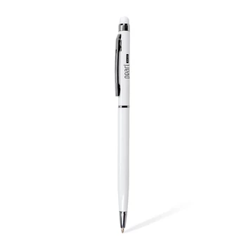 Elegáns, fehér színű, kétfunkciós, emblémázott golyóstoll, kék betéttel.