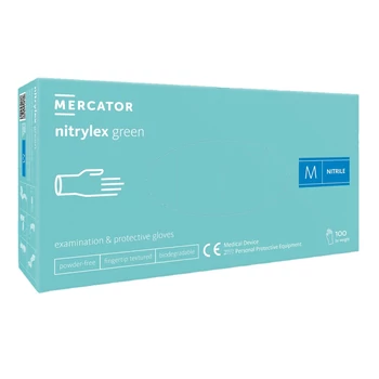nitrylex® GREEN BIOLÓGIAILAG LEBOMLÓ púdermentes, menta/türkiz nitril kesztyű. Több méretben.