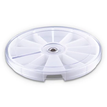 Üres, átlátszó, 12 rekeszes kerek strassztartó strasszkövek, köröm szegecsek, apró műköröm díszek elkülönített tárolására. Praktikus, elforgatható fedővel. A strassztartó átmérője 8 cm.