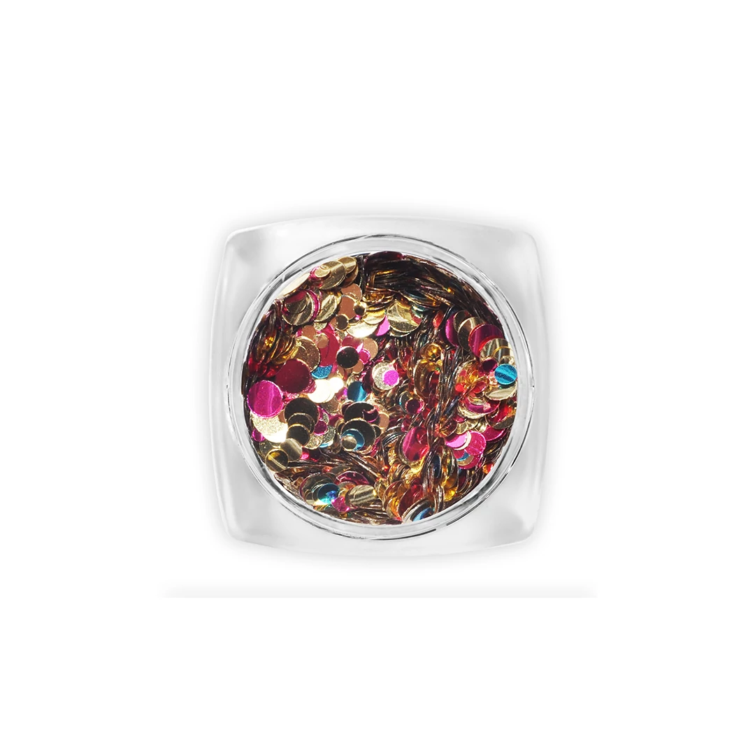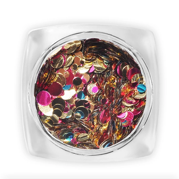 Különböző méretű, fémes hatású körömdíszítő konfettik a gyors, egyszerű és mutatós díszítésekhez.