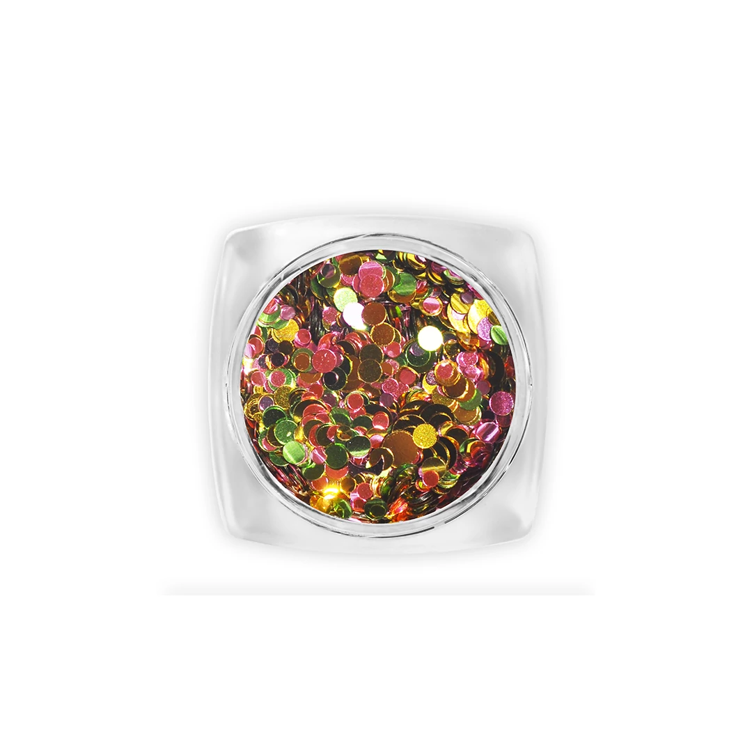 Különböző méretű, fémes hatású körömdíszítő konfettik a gyors, egyszerű és mutatós díszítésekhez.