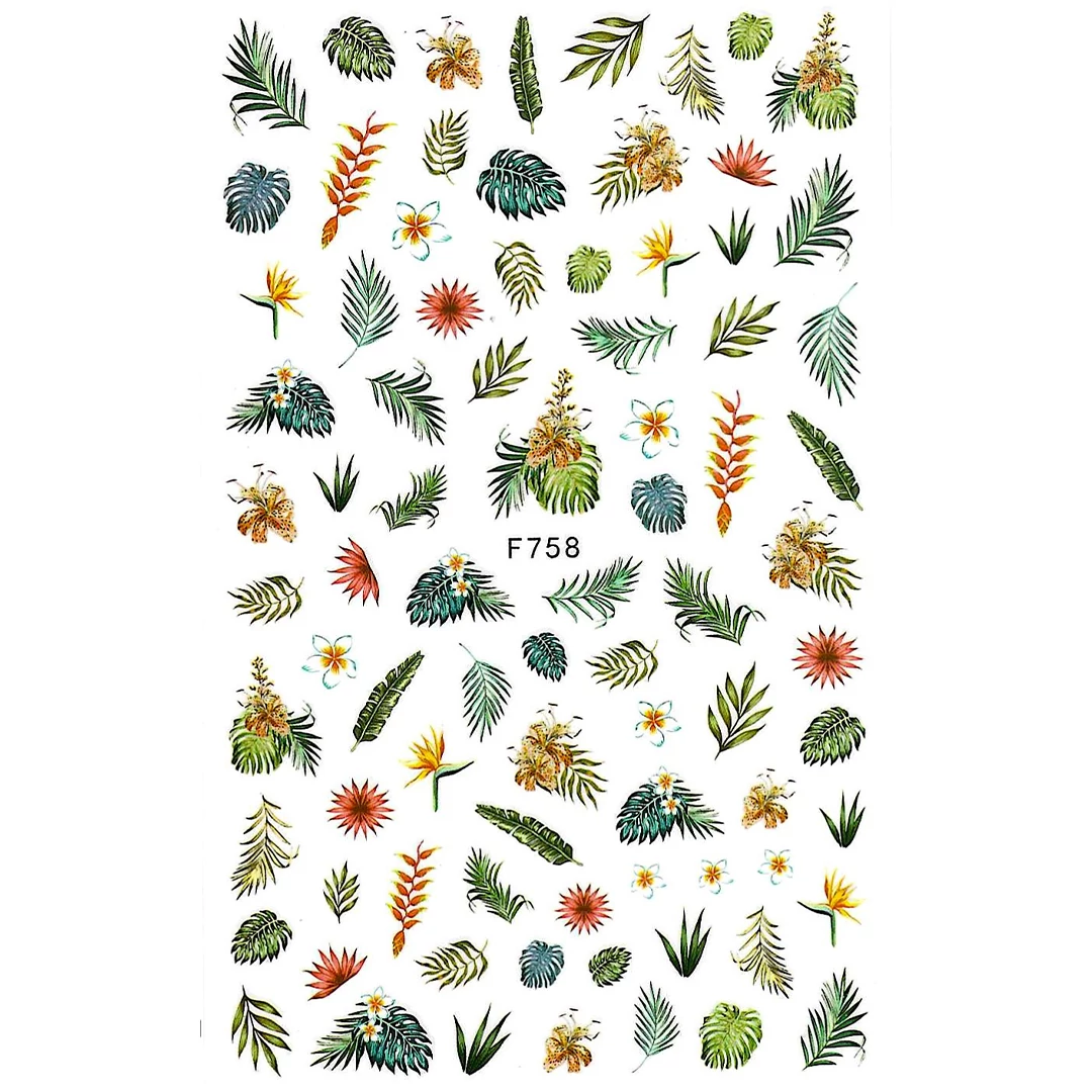 Körömmatrica trópusi levél-és növénymintákkal.
