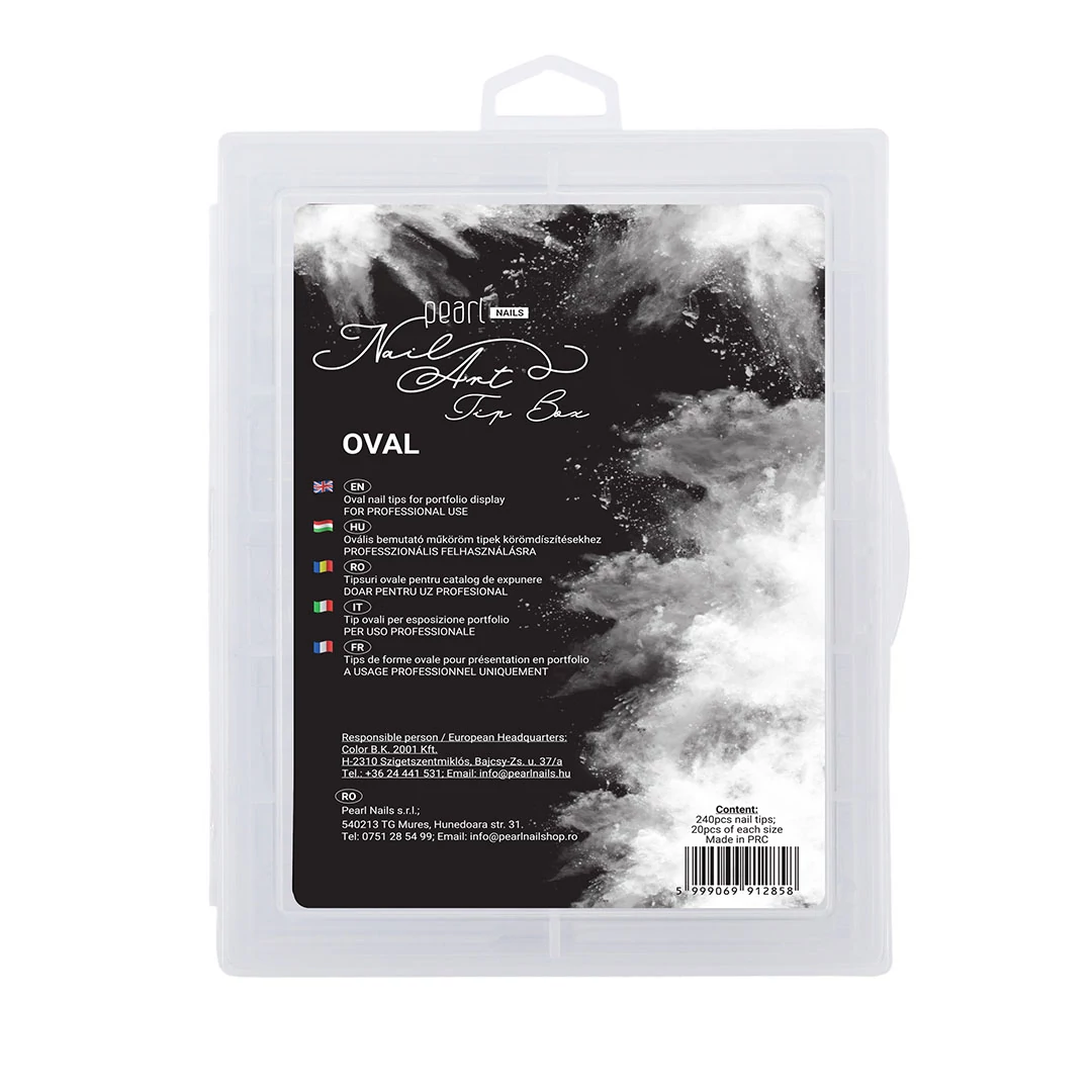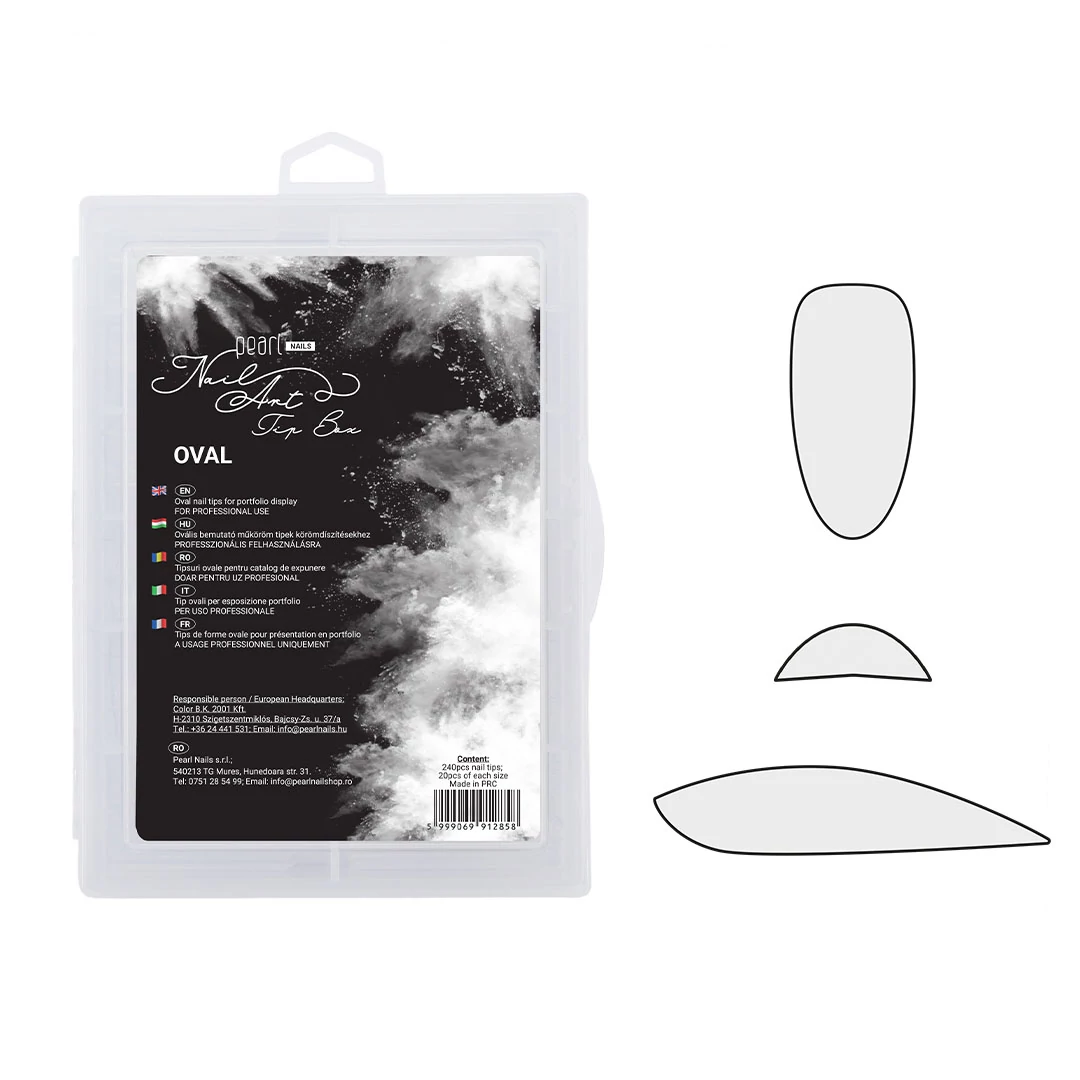 Bemutató tipek műköröm díszítő technikák gyakorlásához és szalondíszítések bemutatásához. Egy box 240 darab azonos méretű, natúr színű és ovális formájú dísztő tipet tartalmaz.