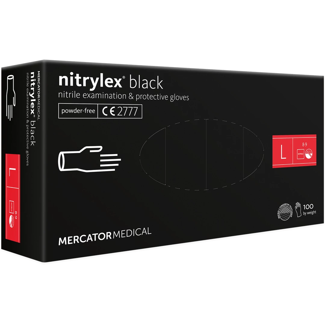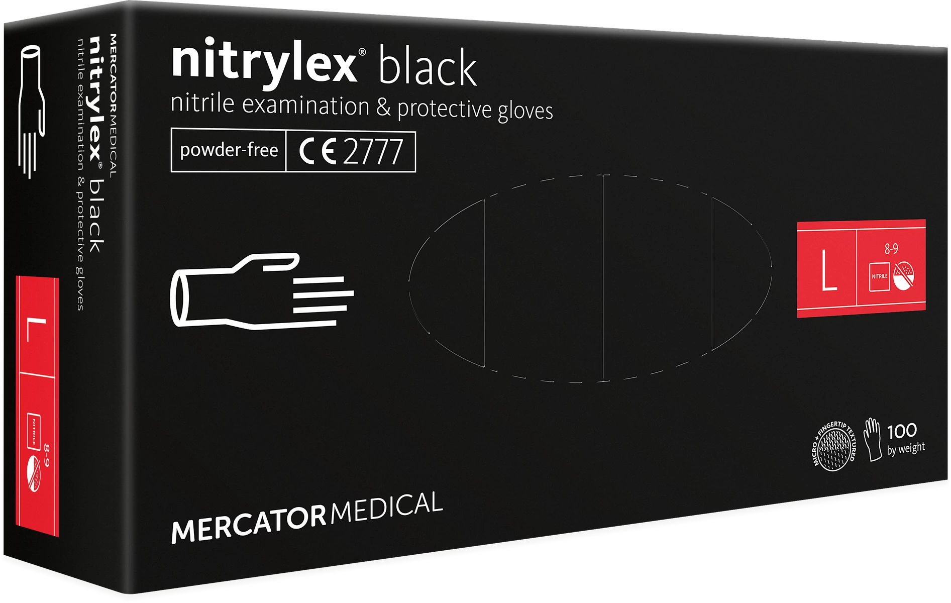 nitrylex® black hagyományos púdermentes nitril kesztyű L-es méretben, amely védelmet nyújt a baktériumok, gombák és vírusok ellen. Univerzális termék fekete színben, amelyen nem látszik meg a kosz. Nem steril.