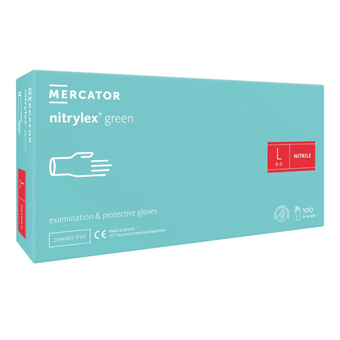 nitrylex® GREEN BIOLÓGIAILAG LEBOMLÓ púdermentes, menta/türkiz nitril kesztyű, L-es méretben.