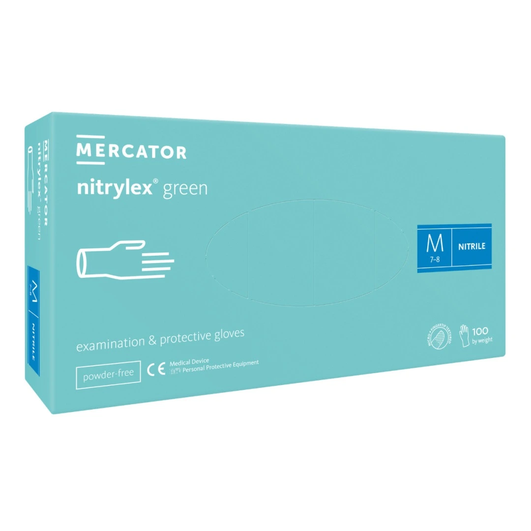nitrylex® GREEN BIOLÓGIAILAG LEBOMLÓ púdermentes, menta/türkiz nitril kesztyű, M-es méretben.