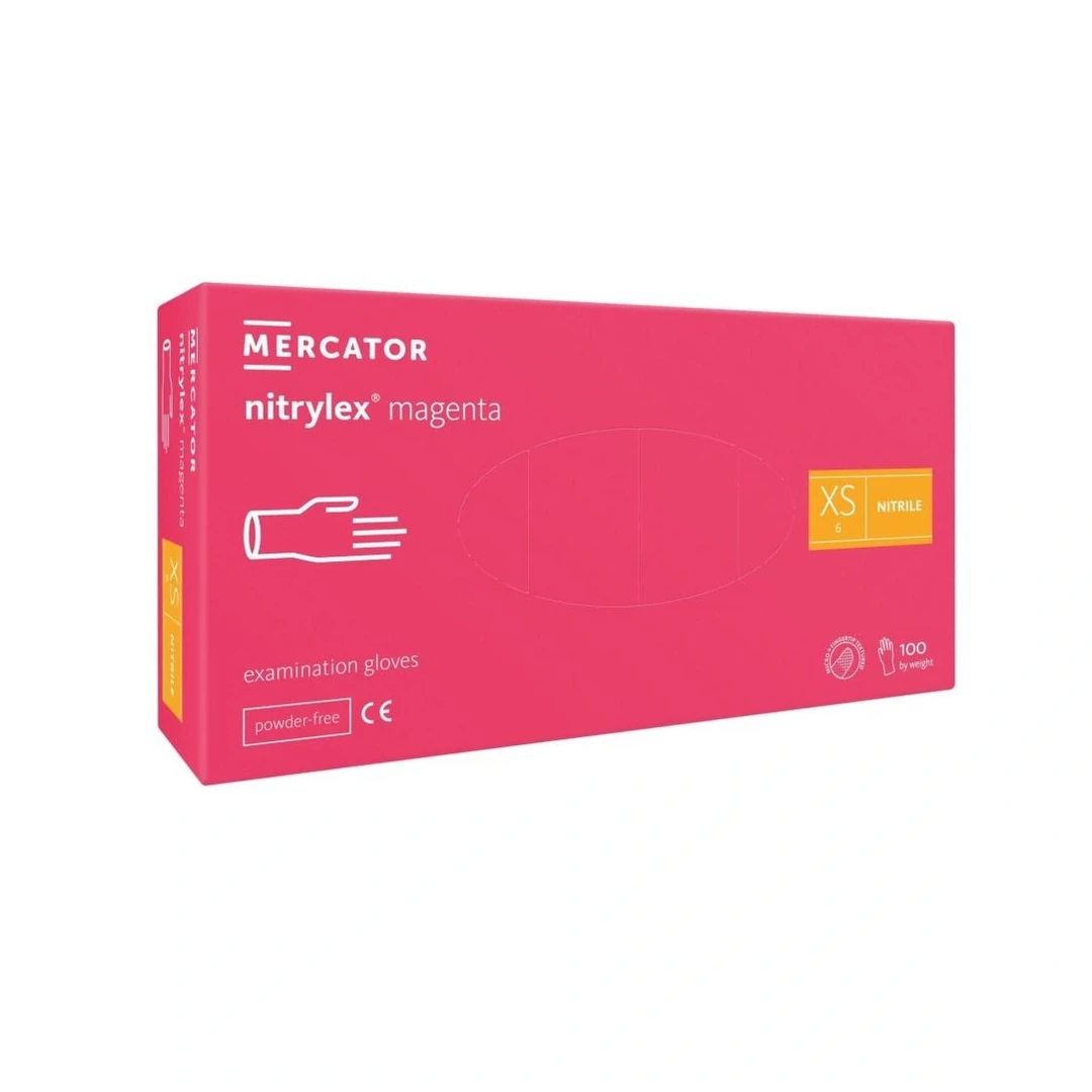 nitrylex® magenta hagyományos púdermentes nitril kesztyű XS-es méretben, amely védelmet nyújt a baktériumok, gombák és vírusok ellen. Univerzális termék rózsaszín színben, amelyen nem látszik meg a kosz. Nem steril.
