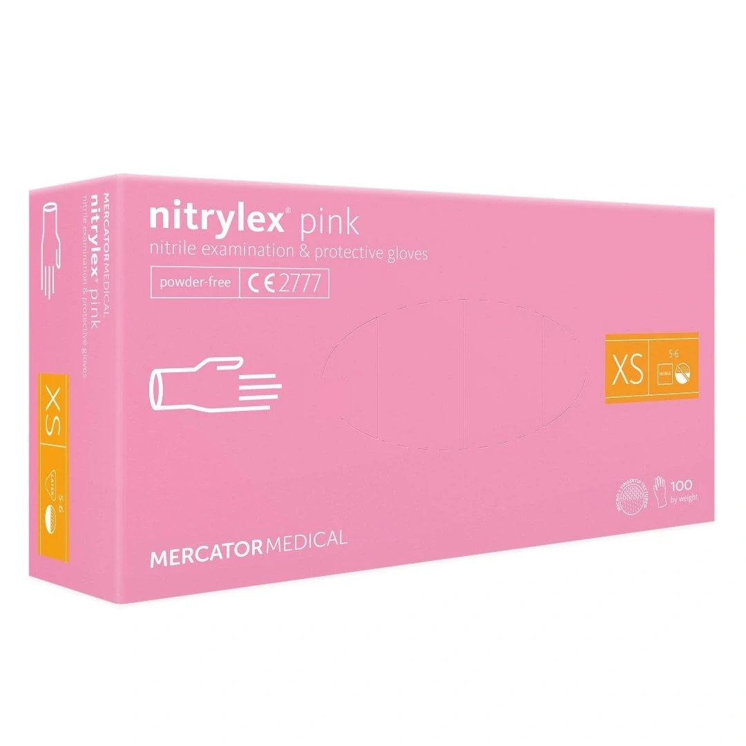 nitrylex® pink hagyományos púdermentes nitril kesztyű XS-es méretben, amely védelmet nyújt a baktériumok, gombák és vírusok ellen. Univerzális termék rózsaszín színben, amelyen nem látszik meg a kosz. Nem steril.
