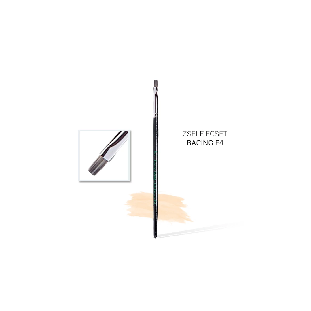 Puha, szintetikus szőrből készült, egyenes végű, 4-es zselé építő ecset. Precízen vágott szőre tökéletes, pontos munkavégzést biztosít. Használatával tartós és gyönyörű zselé műkörmöket tudsz építeni. Racing F4 ecsetünk segítségével könnyebb és gyorsabb az anyagfelvitel, a C-ív kialakítása. Ecset szőrének hosszúsága: ~9mm, a fej szélessége: ~4,5mm. Fekete, fa nyéllel, átlátszó kupakkal.