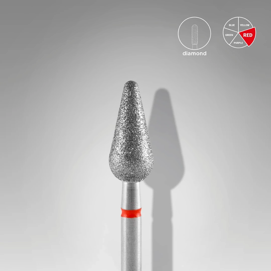 Staleks gyémánt csiszolófej - "lekerekített körte" piros - FA10R050/12 egy finomszemcsés gyémánt csiszológej lekerekített körte formájú, 5 mm átmérőjű és 12 mm munkarész hosszúságú. Ideális bőrrel és természetes körmökkel való munkához manikűrben és pedikűrben.
