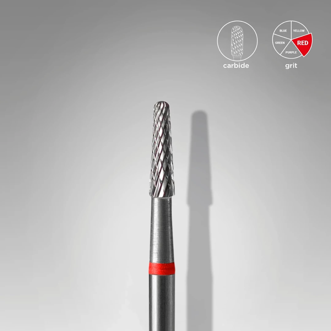 A Staleks karbid csiszolófej - Cone bit piros 2,3mm/8mm - FT71R023/8 egy kúp alakú, 2,3mm átmérőjű, lekerekített hegyű, 8mm-es hosszúságú, finom karbid csiszolófej. Ideális géllakk és zselés anyag eltávolítására, a köröm formájának előkészítésére és formára csiszoláshoz. Kiváló minőségű anyagokból készült.