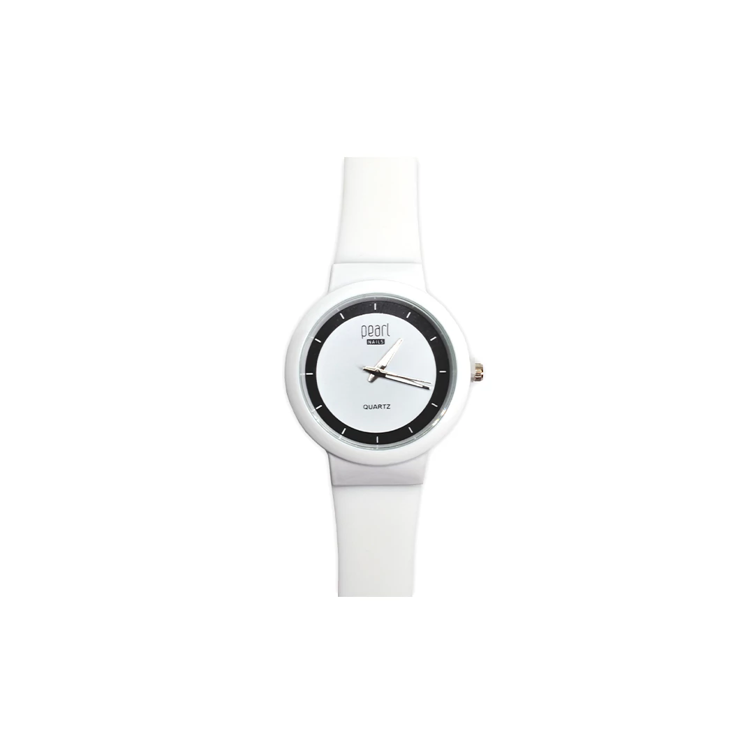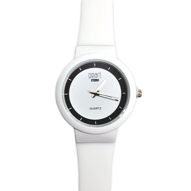 Női karóra fehér szilikon szíjjal, a számlapon Pearl Nails logóval. Az óra teljesen rásimul a csuklóra, kényelmes viselet.